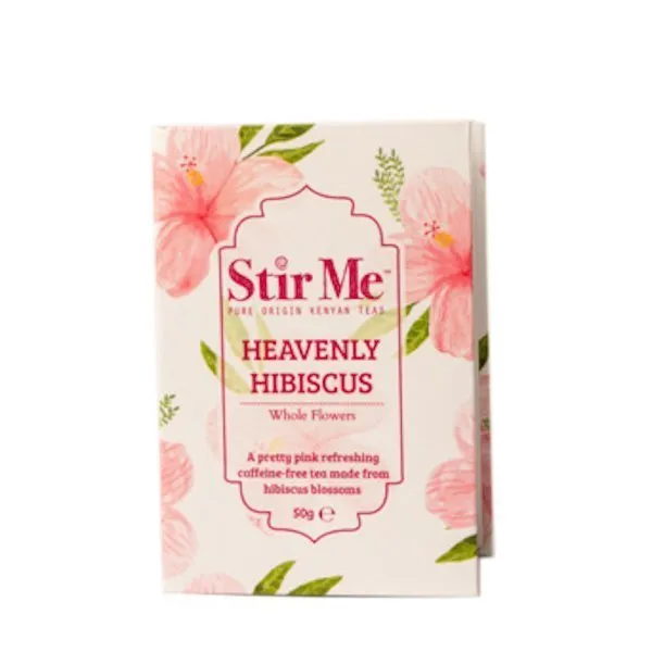 Stir me heavenly hibiscus. Comes loosely packed as whole flowers in a beautiful box to keep them fresh. Has a distinctive taste and sweet aroma and is caffeine-free.