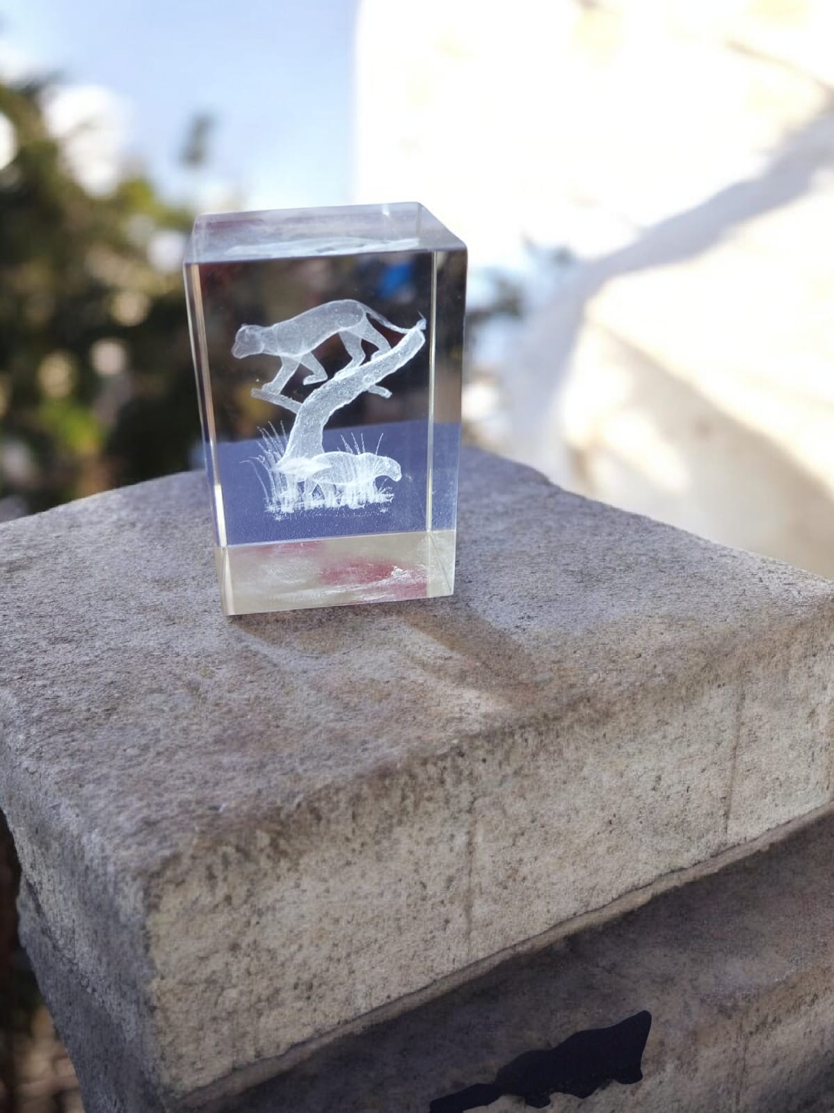 The transparent crystal creates depth and dimension, allowing you to view the leopard from multiple angles. Light passes through and around the engraving, creating stunning visual effects that change throughout the day.
