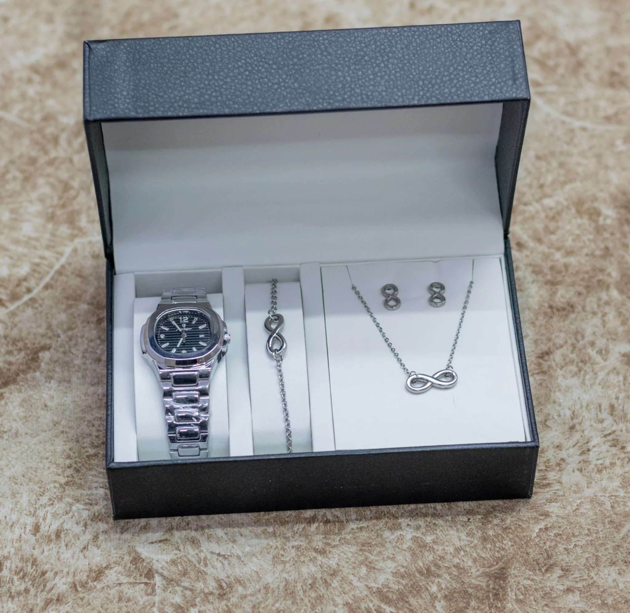 The 4 in 1 ladies’ gift set consists of a watch, bracelet, necklace, and earrings.