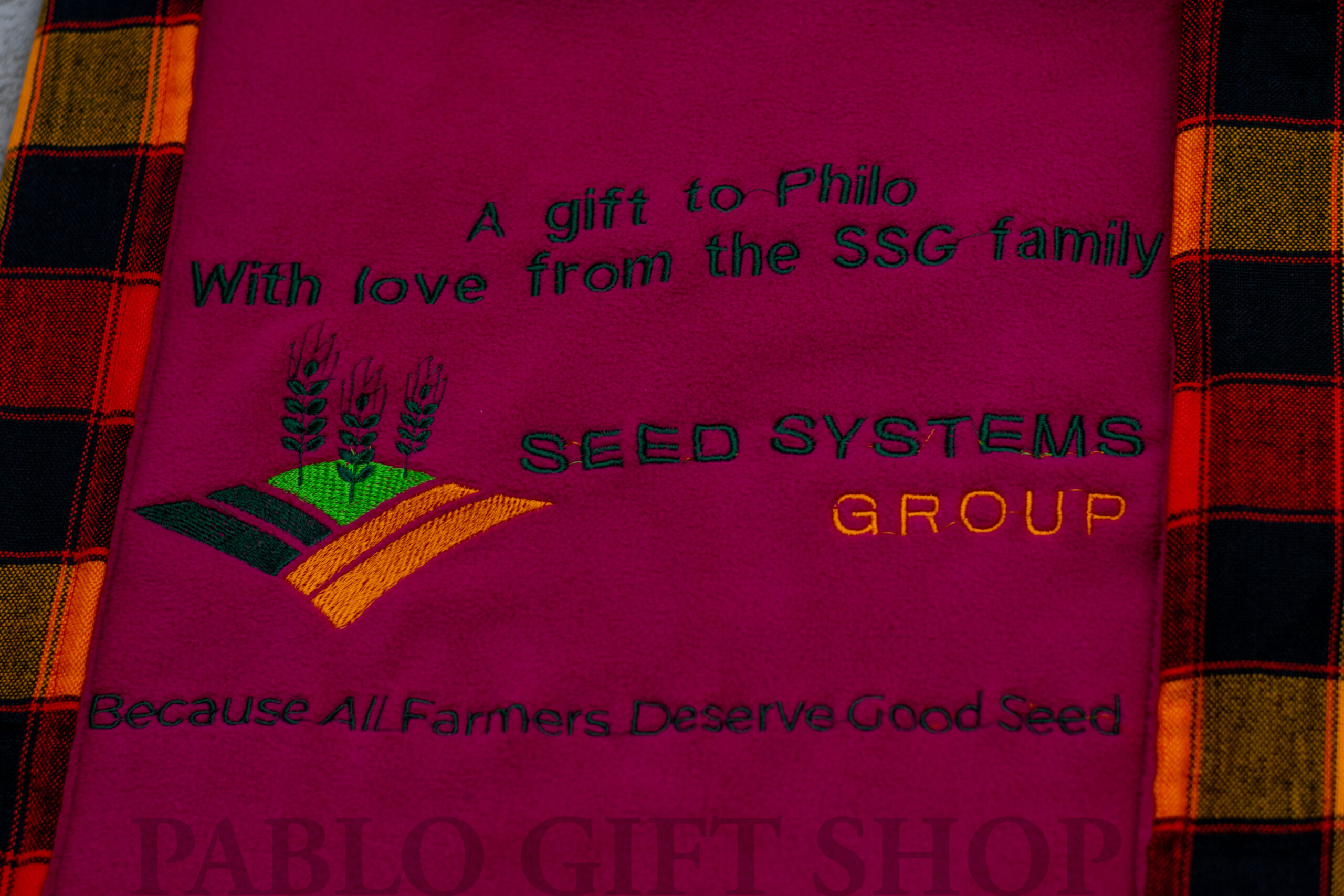 ed Fleece Blanket that has been embroidered with a logo and a message. This blanket has a red fleece blanket and a black and orange Maasai shuka. Here at Pablo Gift Shop, we personalize the blankets by branding them with messages, names, and more. These fleece blankets can be made for employees each having your preferred color combination.