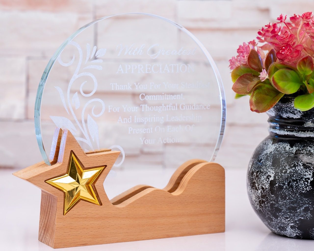 Celebrate the leaders, mentors, and pillars of your organization with an award as unique as their contribution. Our custom-engraved circular glass award features a warm, natural beechwood base accented by a brilliant gold star, blending modern elegance with organic textures.