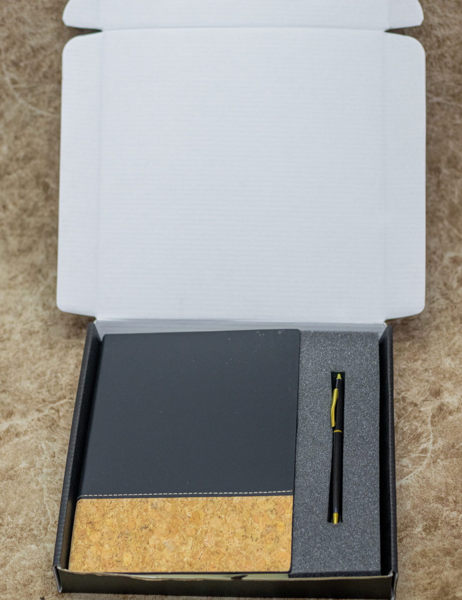 A sleek notebook with a modern black cover and natural cork accent – stylish, sturdy, and eco-friendly.