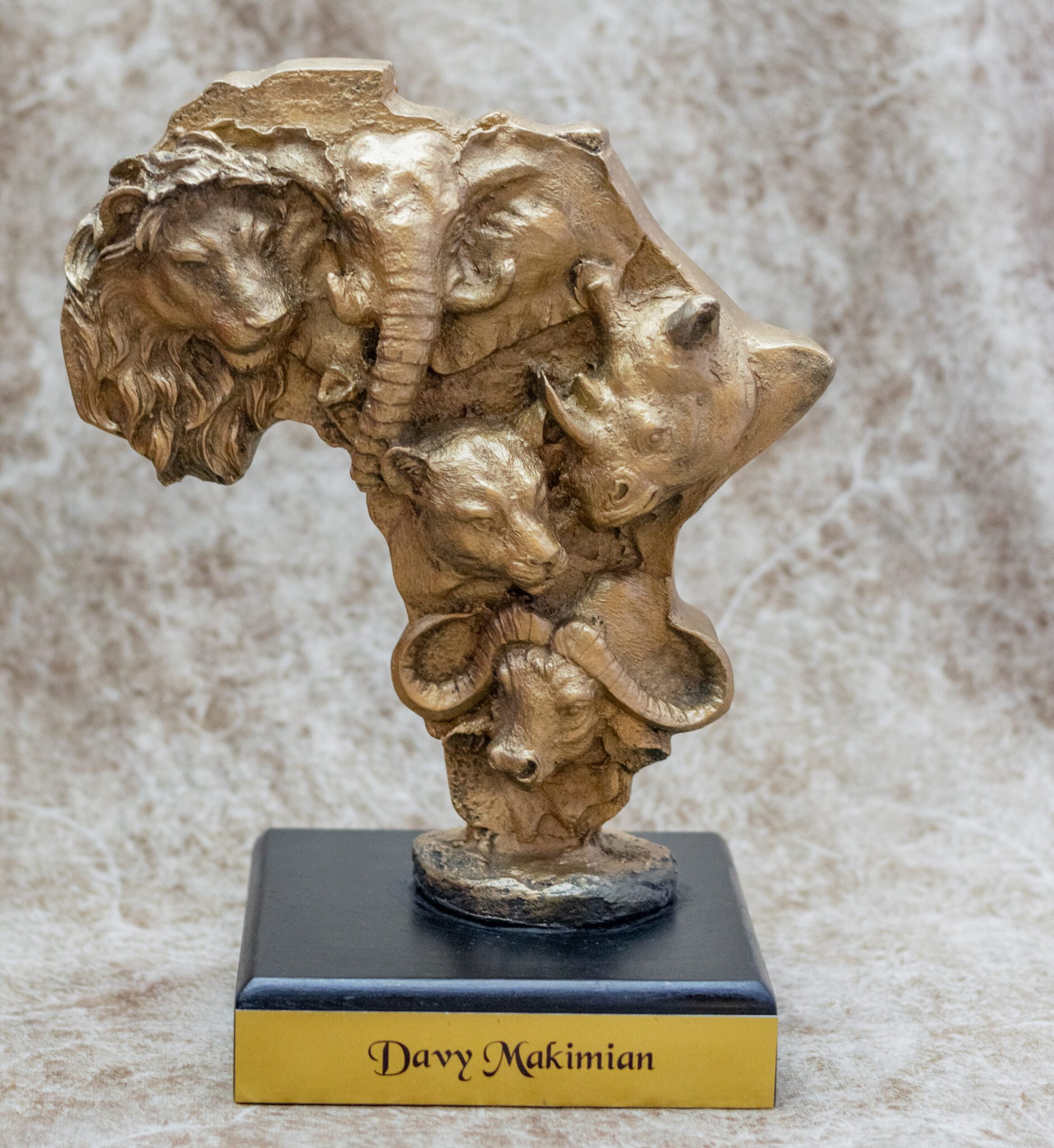 • Mounted on a Black Base: The sculpture rests on a sturdy, sleek black base, featuring a gold plaque that reads “Davy Makimian”—the name of the renowned artist behind this stunning creation.