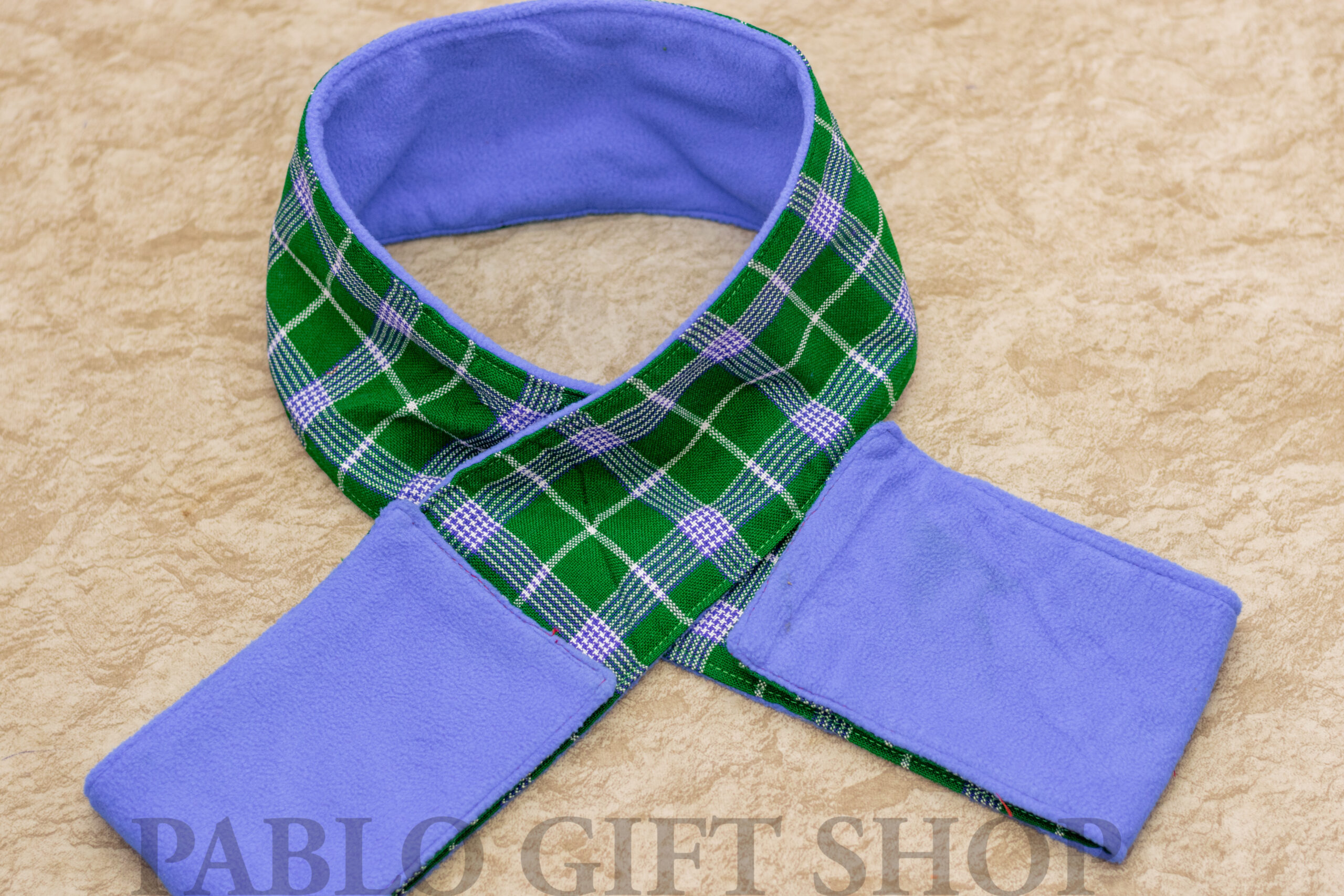 The Green Maasai Scarf is a great gift that can be personalized with a message for a special person. This scarf is a great gift for a dad, husband, wife, friend, and more. The scarf has a royal blue polar fleece that has been joined with a green checked Maasai shuka.