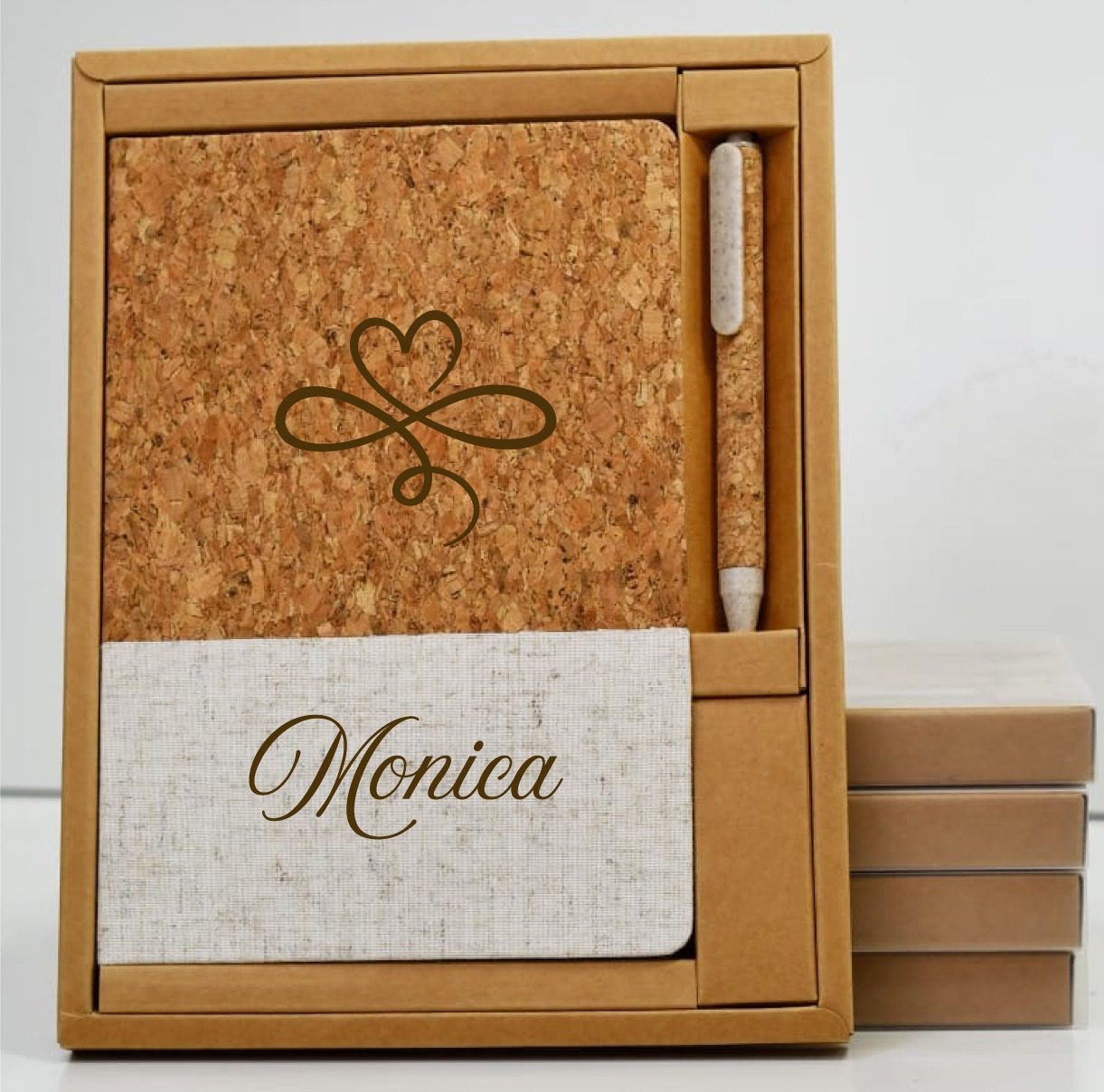 Each custom cork journal features laser-engraved personalization that makes it uniquely theirs. The “Monica” shown here is just one example of how you can create a one-of-a-kind gift that will be treasured for years to come. The elegant heart infinity symbol adds a touch of timeless beauty to every cover.