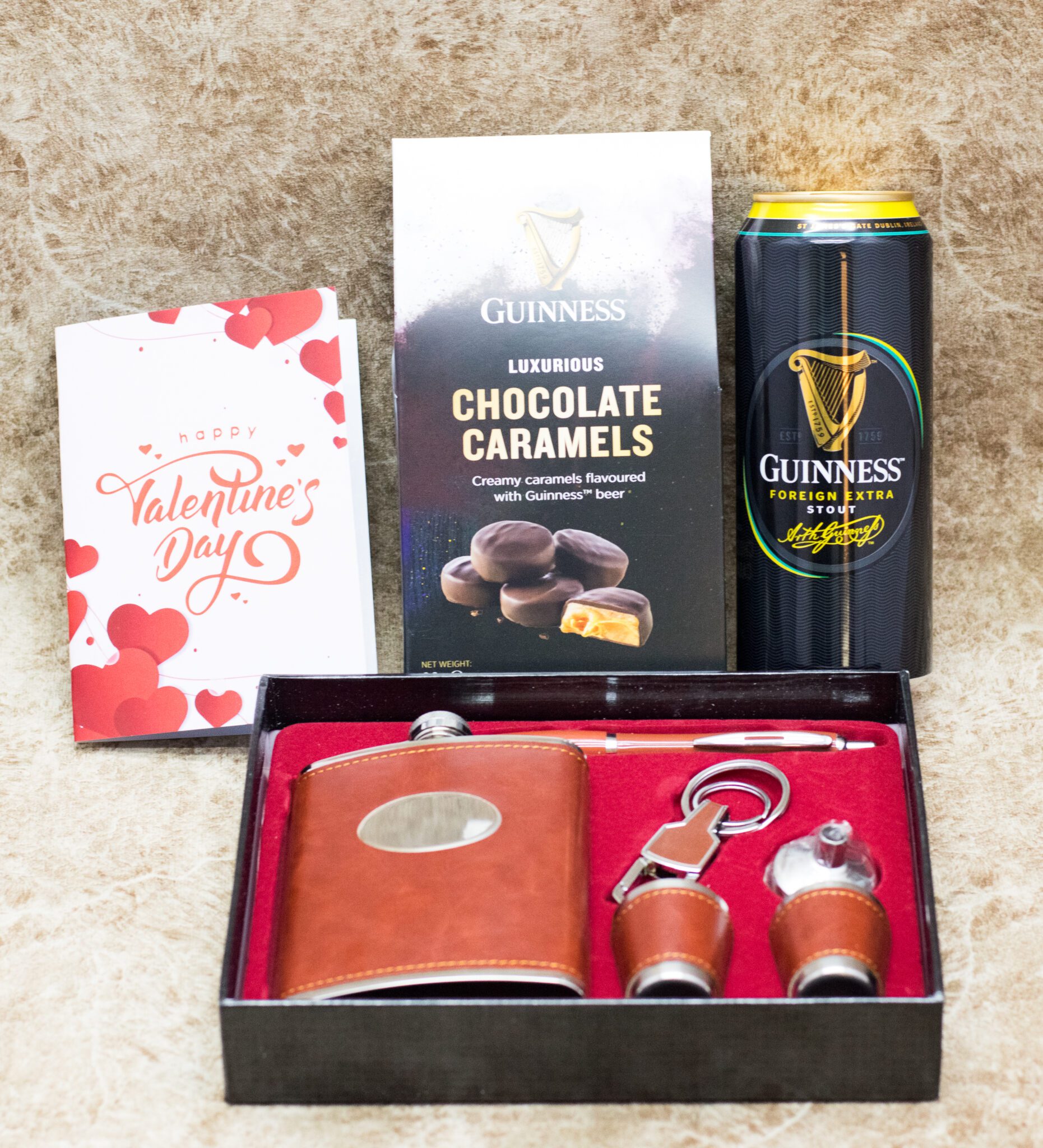 ✓ Premium Quality – Authentic Guinness products paired with genuine leather accessories ✓ Complete Gift Solution – Everything beautifully packaged and ready to gift ✓ Versatile Flask Set – Perfect for outdoor adventures, travel, or special occasions ✓ Gourmet Treats – Luxurious chocolate caramels that perfectly complement the beer experience ✓ Romantic Presentation – Elegant packaging perfect for Valentine’s Day gifting
