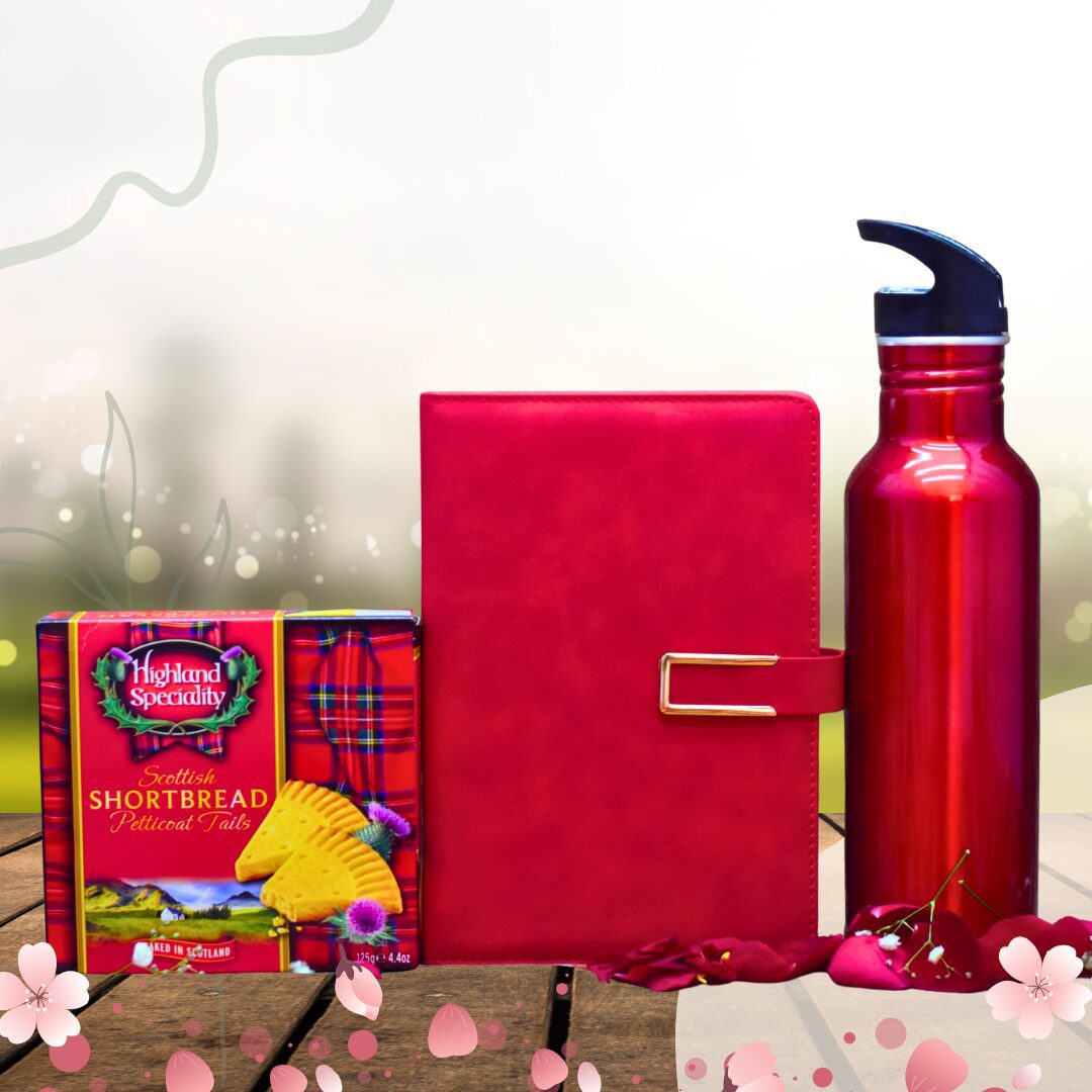 Indulge in timeless sophistication with our Red Elegance Collection, featuring authentic Scottish shortbread, a luxurious notebook, and a sleek metallic water bottle – a perfect harmony of gourmet treats and practical essentials in stunning coordinated red.