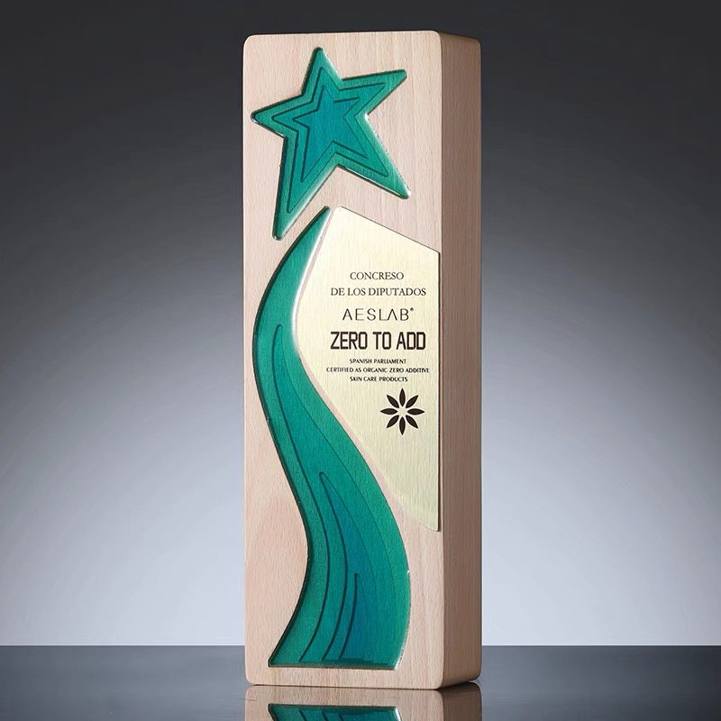 Crafted from premium solid light-grain wood, this award features a striking, recessed emerald-green resin inlay. The flowing wave leads the eye upward to a bold, multi-dimensional star, symbolizing growth, momentum, and reaching the pinnacle of success.