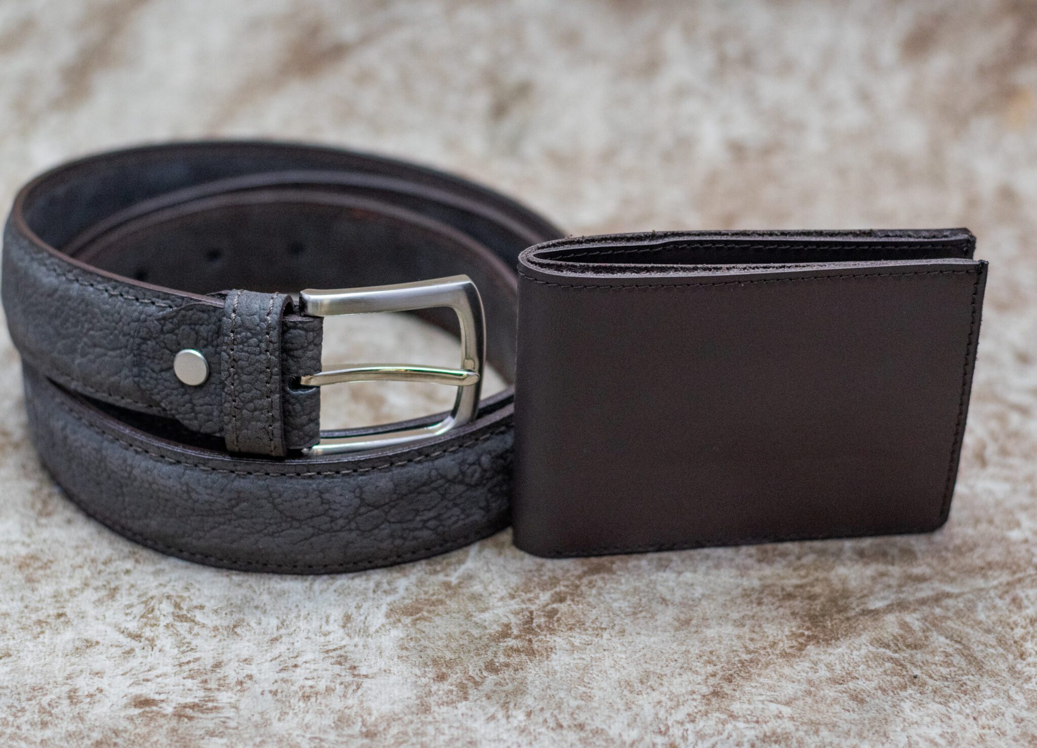 This set features a deep espresso-toned bifold wallet and a matching textured leather belt, designed for the man who appreciates the finer details. Crafted from premium hides, these pieces are built to age beautifully, developing a unique patina that tells your story.