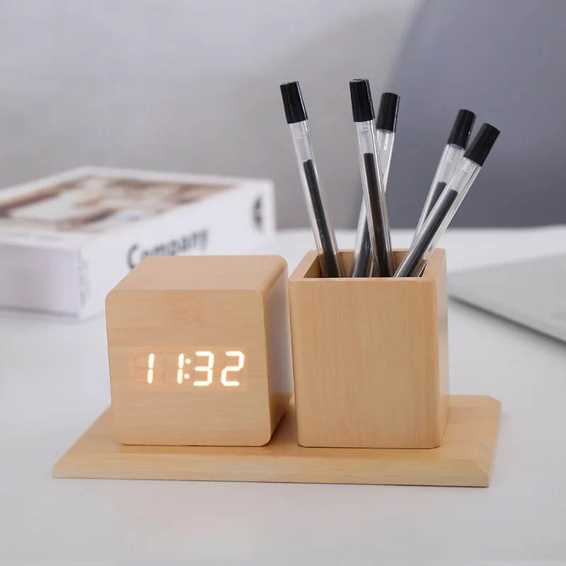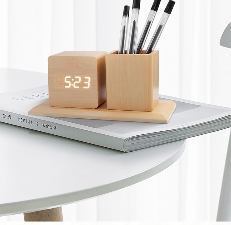 Wooden Pen Holder with LED Digital Clock